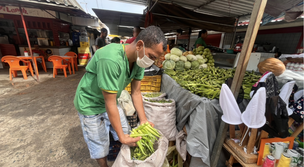 Já no setor de hortifrúti, o quiabo — ingrediente fundamental do caruru — também teve reajuste. Segundo o vendedor Josiel Souza, os preços variam conforme a qualidade e a origem.